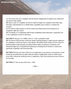 “Businesses that play by the rules shouldn’t have to compete against businesses that cheat by hiring illegal labor,” said Rep. Mace. “And South Carolina workers shouldn’t have their wages driven down by employers breaking the law.”