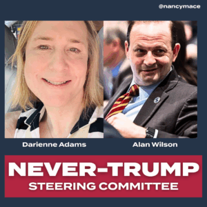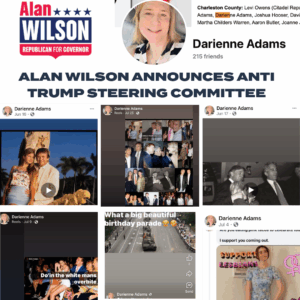 One glaring example: Darienne Adams, listed as a Charleston County member of Wilson’s steering committee. Adams is a proud Never-Trump activist whose social media is a nonstop stream of attacks against President Donald J. Trump, relentless mockery of America First leaders, and cheerleading for the Left’s radical agenda.