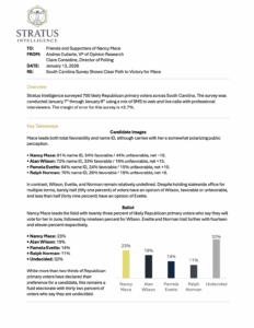 The survey, conducted by Stratus Intelligence from January 7-9 among 700 likely Republican primary voters, carries a margin of error of ±3.7 percent. Mace’s four-point lead falls outside the margin of error, establishing her as the clear frontrunner heading into the June primary.