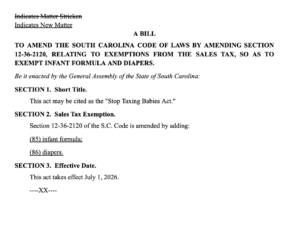 The “Stop Taxing Babies” proposal would amend Section 12-36-2120 of the South Carolina Code of Laws to add infant formula and diapers to the list of items exempt from the state sales tax.